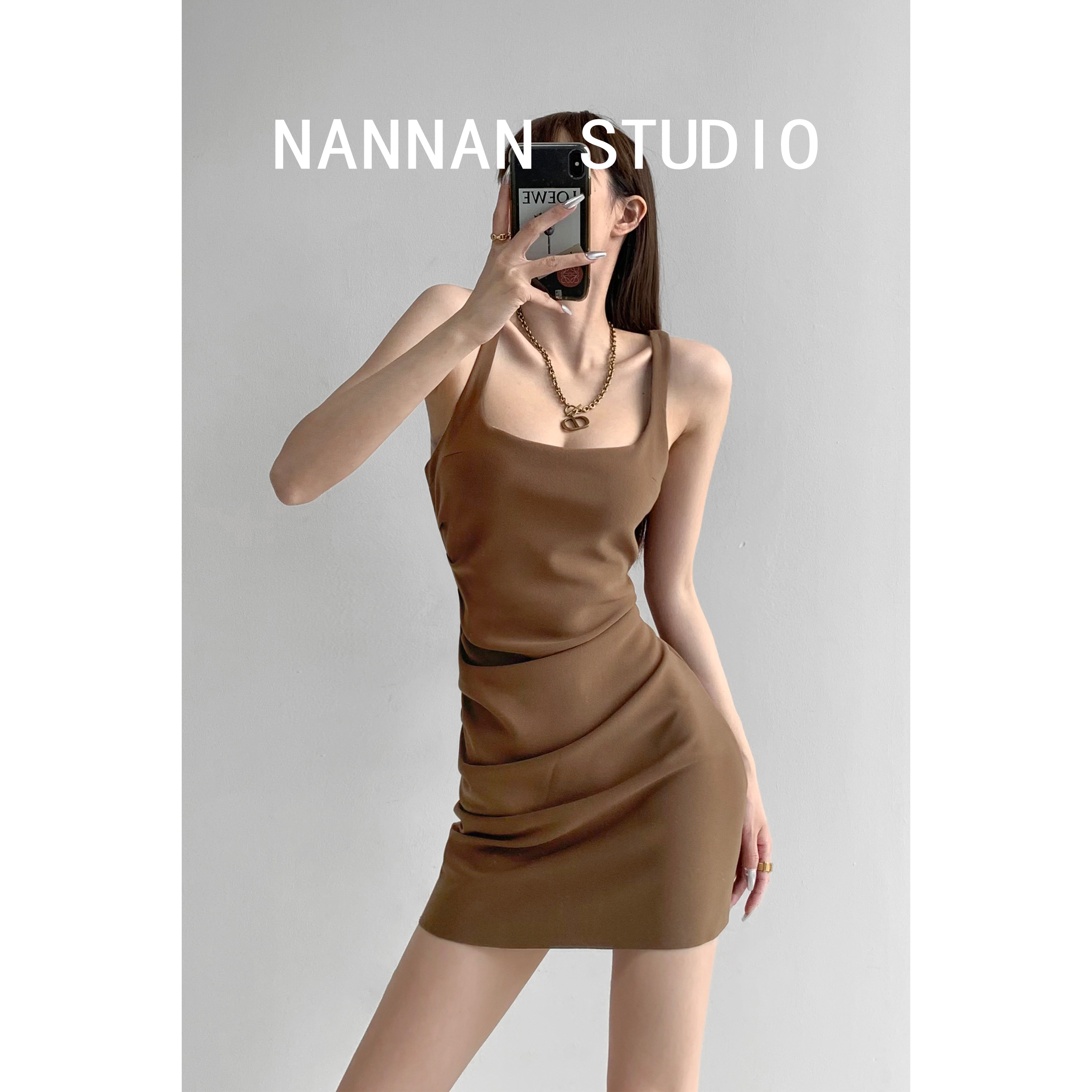 Kendall Jenner Style Square Neck Ruched Waist Bodycon Dress Women High Waist Slimming Sleeveless Slip Dress Hot Girl Short Dress Trendy
