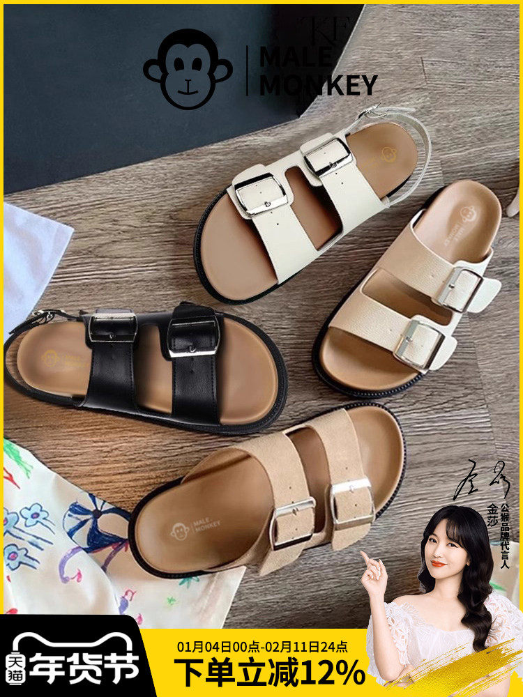 Genuine Leather Slippers for Women, New Summer Style, Thick-Soled, Square Buckle, Casual Beach Birkenstock-Style Sandals, Flat Roman Sandals