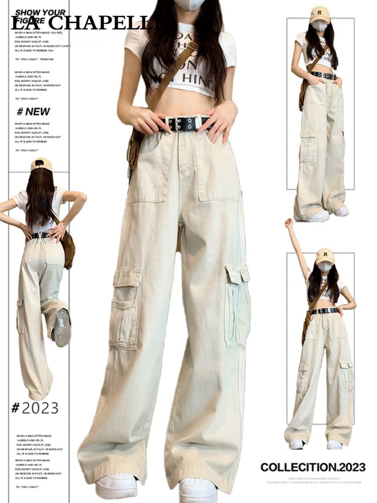 La Chapelle White American-Style Cargo Pants for Women, Cool and Stylish, 2025 New Fleece-Lined Autumn and Winter Wide-Leg Pants for Petite Figures