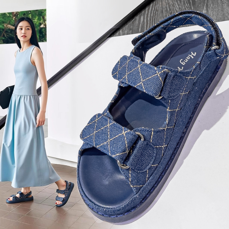 Tweed Style Sandals for Women, Summer Outerwear, 2025 New Style, Flats-Soled Velcro Soft-Soled Beach Shoes, Large Size 41 to 43