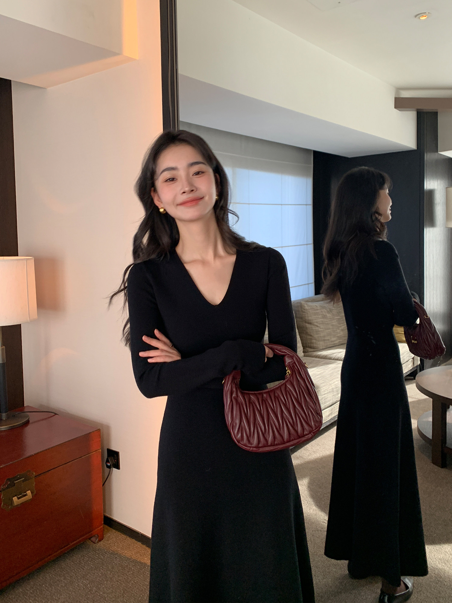 Pusumede Bonus Series V-Neck Knitted Dress for Women, Long-Sleeved, Waist-Cinching, Inner Layering Dress, Elegant Long Dress