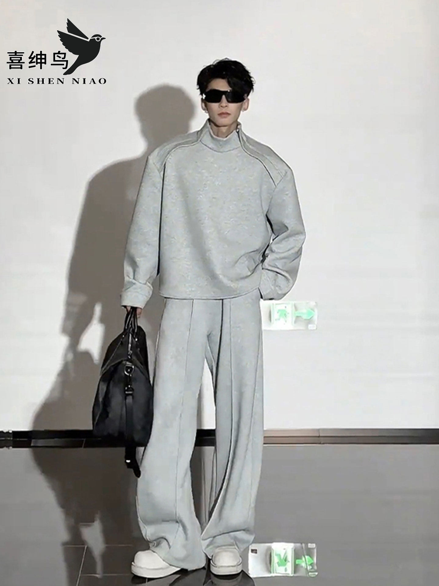Xishenbird American-Style Trendy Fashion Sports Suit for Men, Autumn Deconstructed Design, Half-High Collar Sweatshirt and Sweatpants Set