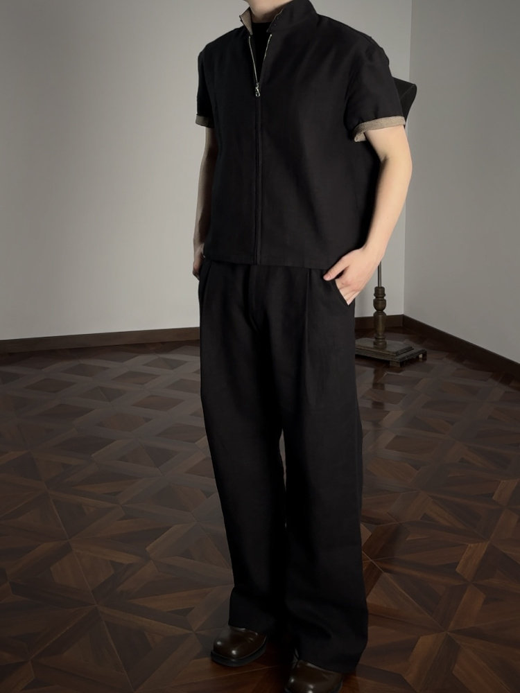 Osens Imitation Linen-Feel Lightweight Woven Fabric New Chinese Style Lapel Polo Half-Button Short-Sleeve Shirt for Men Summer
