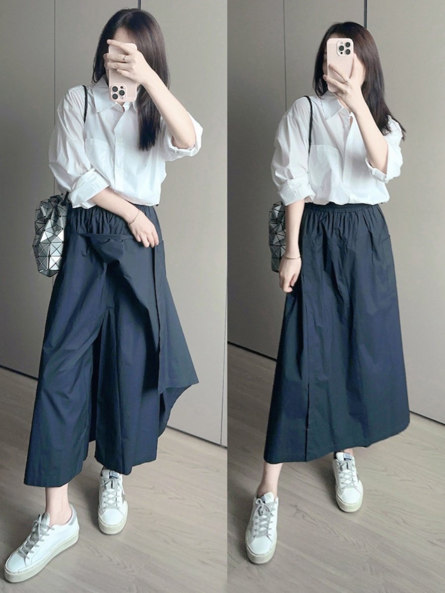 Yamamoto Workwear Style Petite Casual Skirt Pants for Women, Plus Size, Elastic Waist, Slimming A-Line Mid-Length Skirt