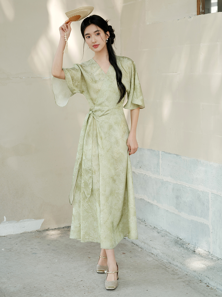 Chu Chan New Chinese Style Hanfu Dress for Women 2025 Summer Chinese Style Wide Sleeve Jacquard Green Elegant Tie-Up Long Dress