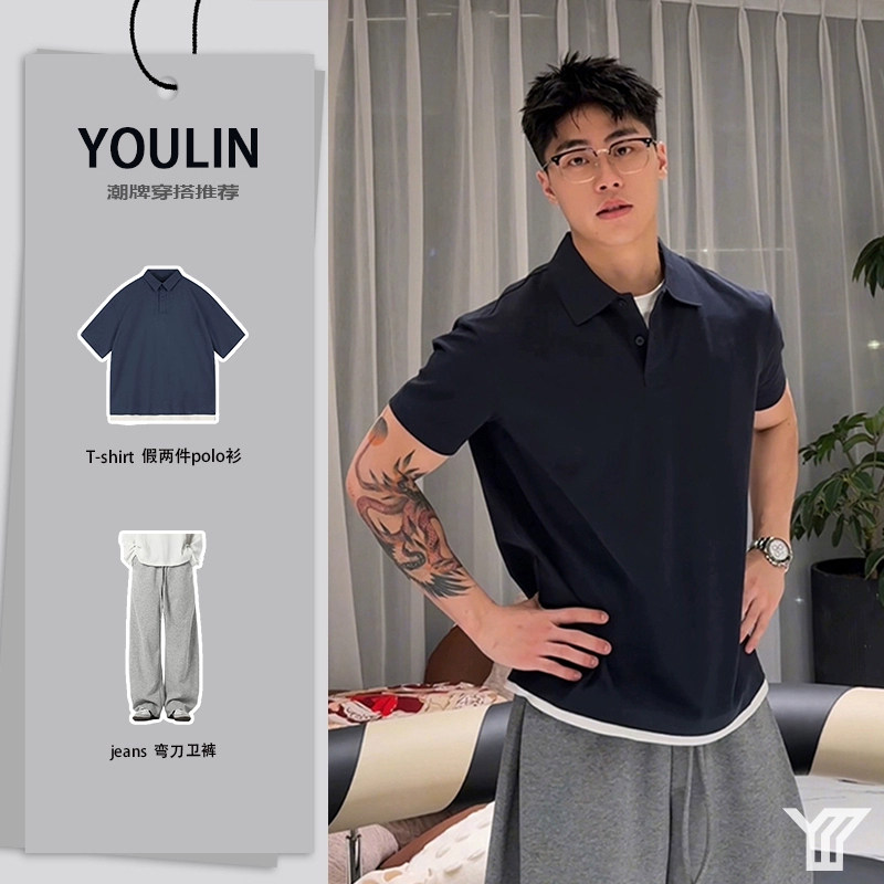 Navy Blue Fake Two-Piece Regular Shoulder Short-Sleeve Polo Shirt Men's Summer Outfit Complete Set Ootd Outfit Heavyweight T-Shirt