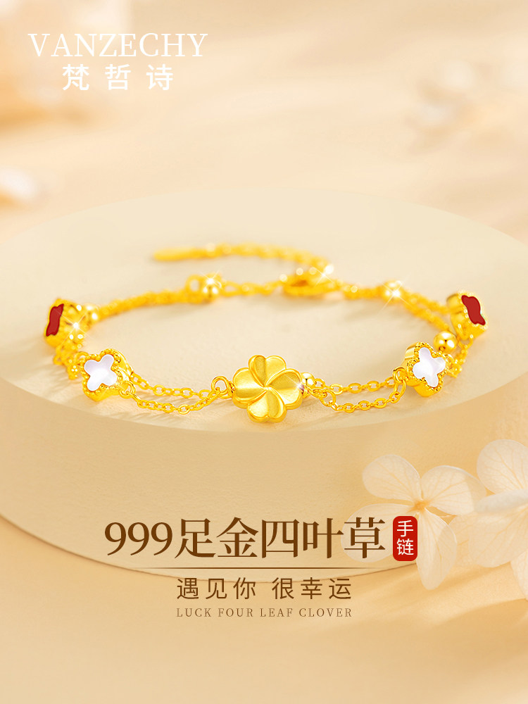 Vanzhi Shi French Brand Genuine 999 Pure Gold Four-Leaf Clover Bracelet for Women, Christmas Gift for Girlfriend