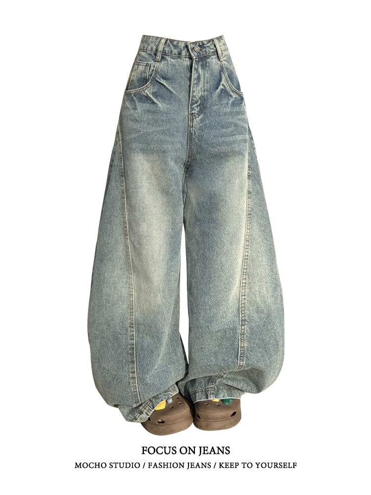 American Retro High-Waisted Scimitar Jeans for Women, Spring and Autumn Style, High Street Design, Loose, Slimming, Drapey Wide-Leg Pants