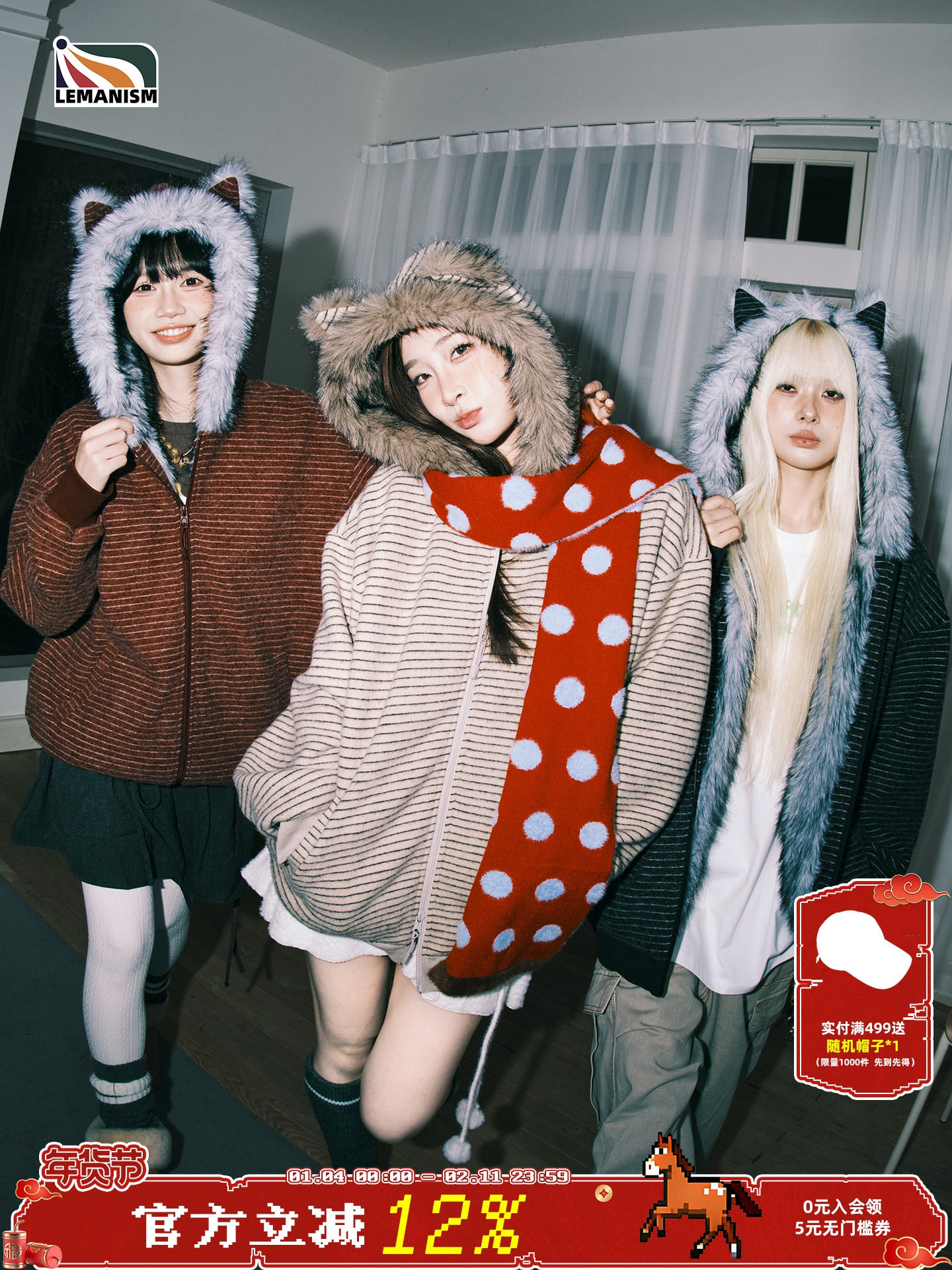 Lemanism American-Style Hooded Jacket with Ear Stripes and Fur Collar, Men's Padded Jacket, New Autumn and Winter Cotton Coat