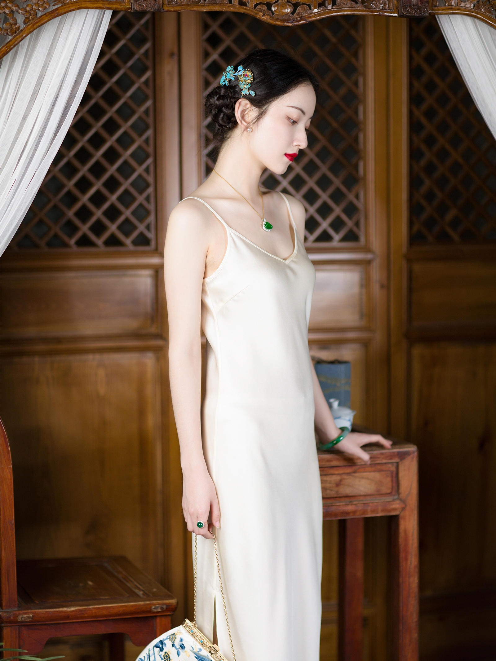 Lan Ling | a City of Wind and Snow | Gentle Style Spaghetti Strap Dress, Mid-Length Cheongsam Base Layer, Slim-Fitting Petticoat
