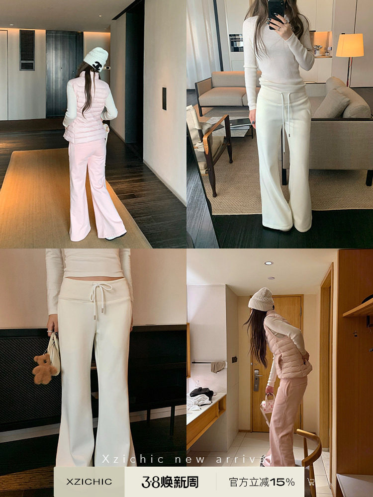 Xzichic【In Stock】Fleece-Lined Flared Sweatpants for Women, New Casual Floor-Length Pants, Mid-Low Waist Drawstring Pants