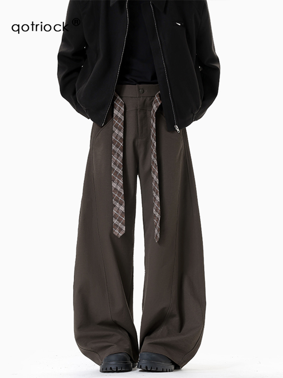 Old Money Style Retro Plaid Belted Knife-Cut Trousers for Men and Women, Autumn High-End Thickened Wide-Leg Casual Pants
