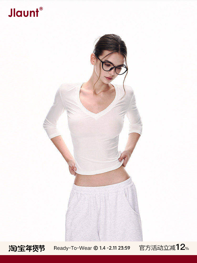 Jlaunt White Short-Sleeved T-Shirt for Women, Spring and Autumn Design, Slim Fit, Versatile V-Neck Long-Sleeved T-Shirt, Hot Girl Top