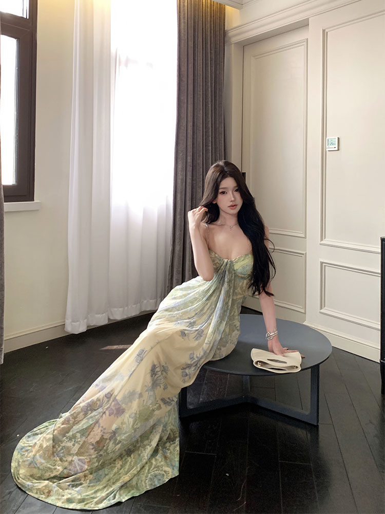 Hainan Sanya Seaside Vacation Pure and Elegant Long Dress French Green Print Tie-Dye Strapless Spaghetti Strap Dress Women's Floor-Length