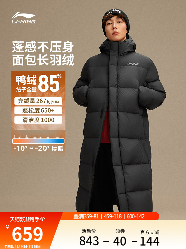 Li-Ning Hot Pot Long down Jacket for Men 2025 New Hooded Loose Top Autumn Casual Duck down Sportswear