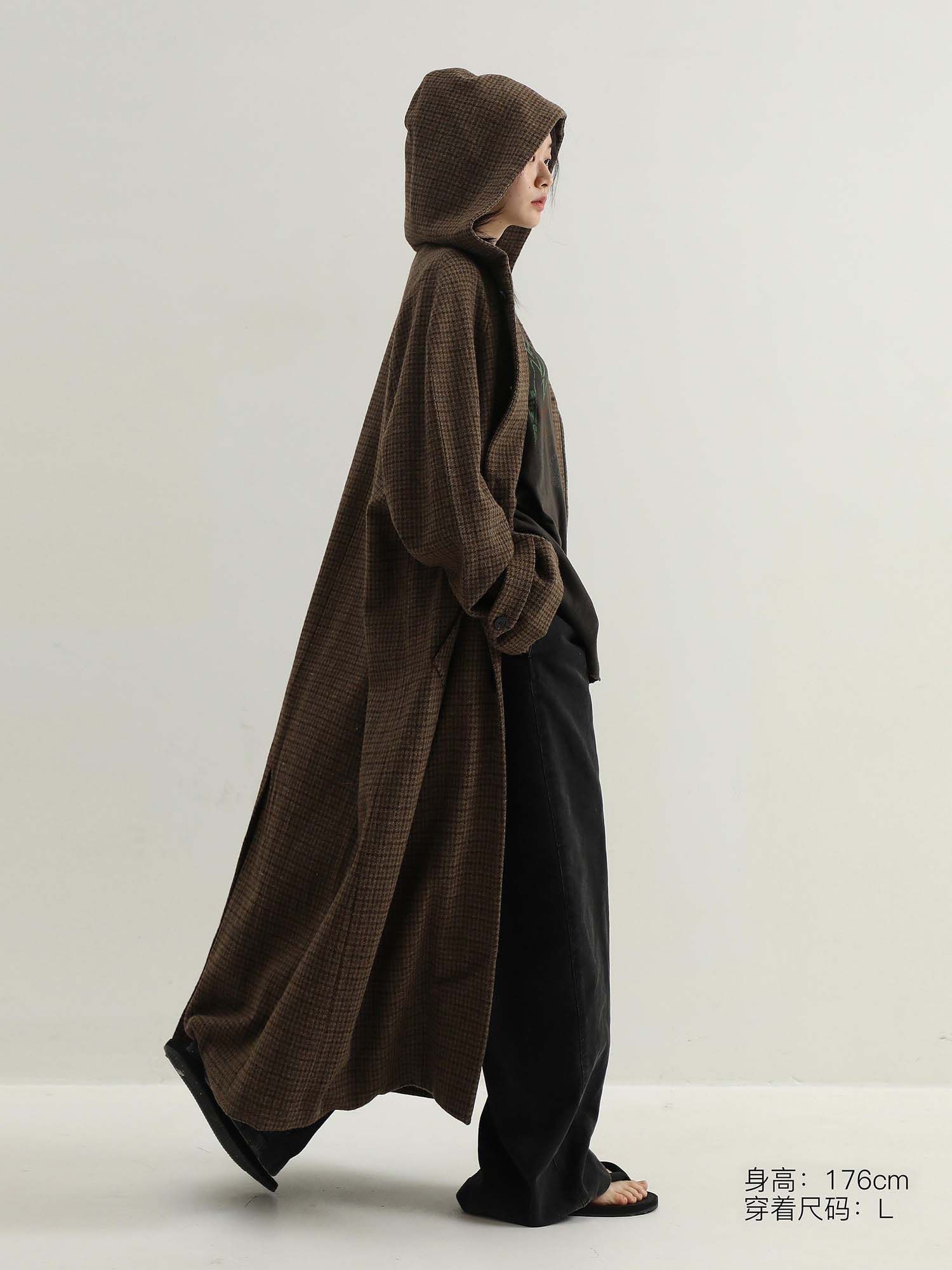 Masonprince* People Who Know How to Wear Things Well in Paris, Retro Plaid Curved Structure Hooded Wool Coat
