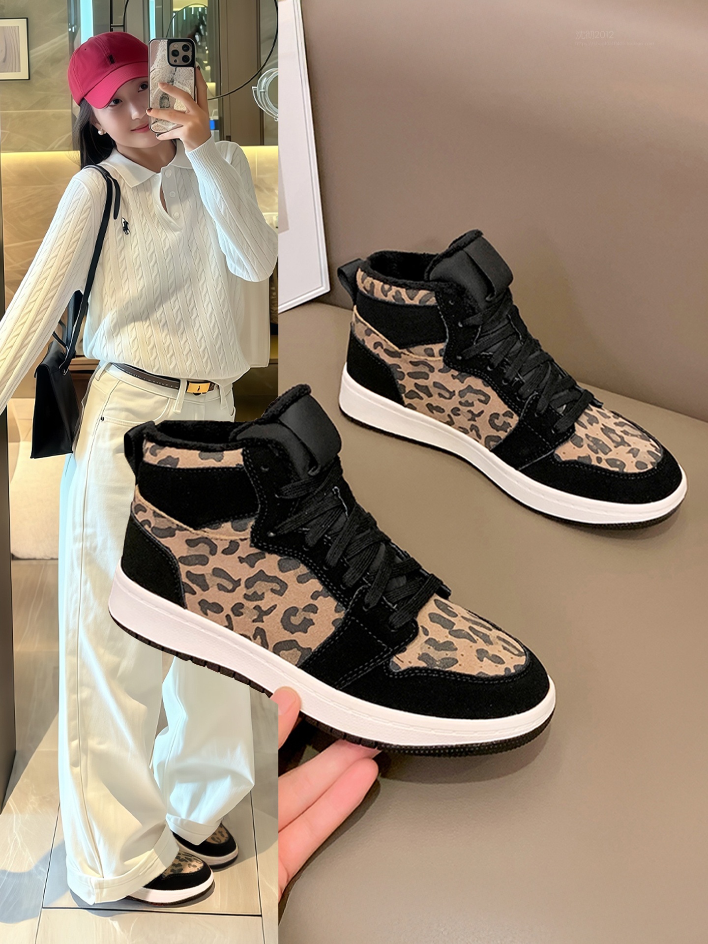 Hong Kong Retro Leopard Print Comfortable High-Top Shoes for Women 2025 Autumn and Winter New Versatile Fashionable Flat Casual Sports Sneakers