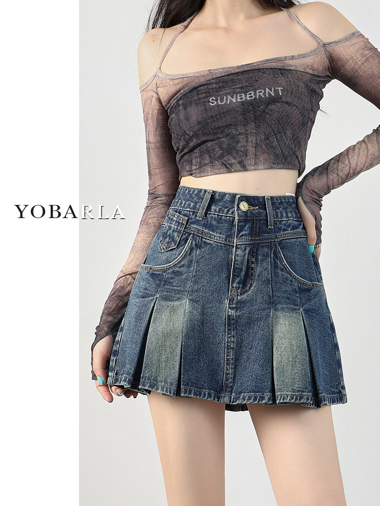Retro Pleated Denim Short Skirt for Women, High-Waisted, New Summer Style, Plus Size, Slimming, Pear-Shaped Body, A-Line Skirt