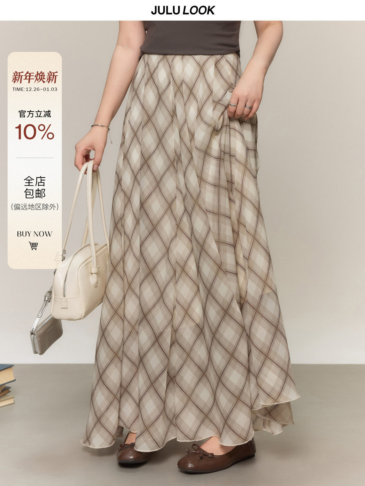 Julu Studio's "Gentle Rose Color" Plaid Midi Straight Skirt for Plus-Size Women, Slimming Effect, Large Size Half Skirt