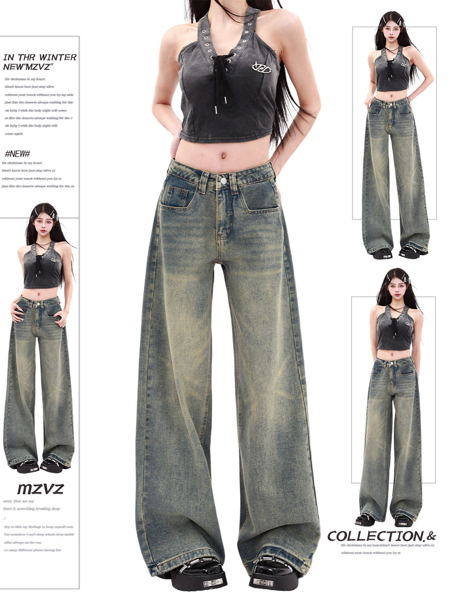 Mzvz American Retro Washed Distressed Wide-Leg Jeans for Women, Autumn Low-Waist Straight-Leg Pants, Floor-Length Trendy Pants