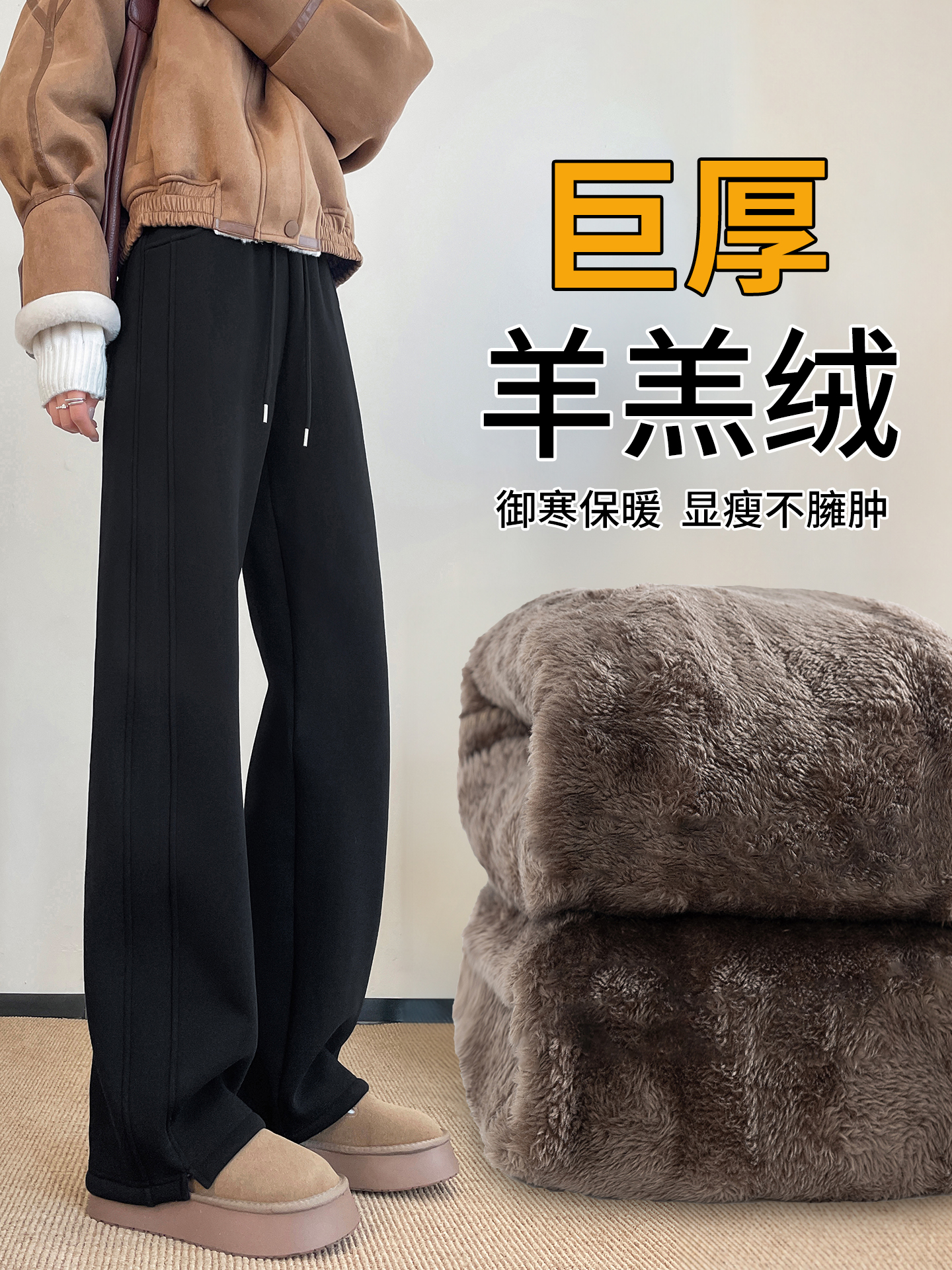 Black Fleece-Lined Thick Wide-Leg Pants for Women, Autumn and Winter Lamb Wool, Suitable for Wearing Outside in Northeast China, High-Waisted Extra Thick Straight-Leg Pants