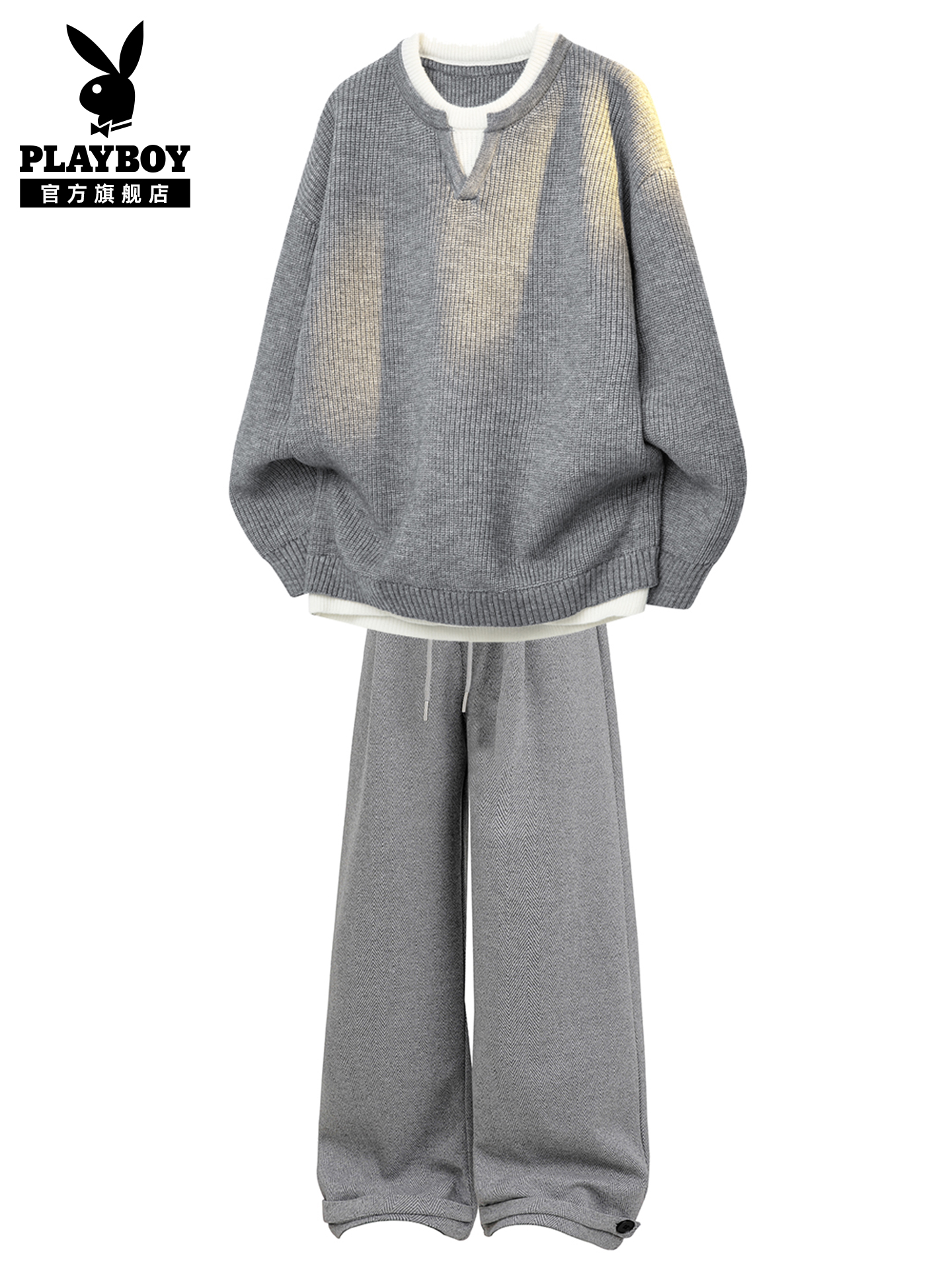 Playboy Fake Two-Piece Knit Sweater Men's Spring and Autumn Sweatshirt Loose Straight-Leg Pants Casual Suit Men K
