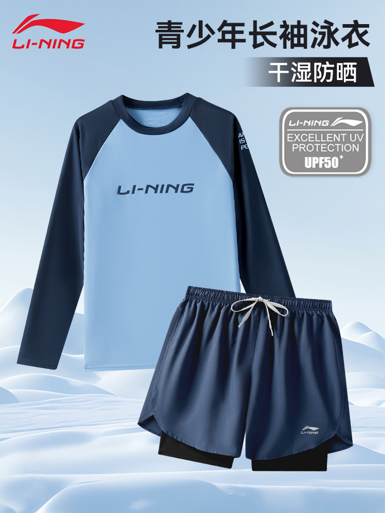 Li Ning Swimsuit for Boys, Long-Sleeved Sun Protection Two-Piece Top, Junior High School Boys' Professional Surfing and Swimming Trunks Set