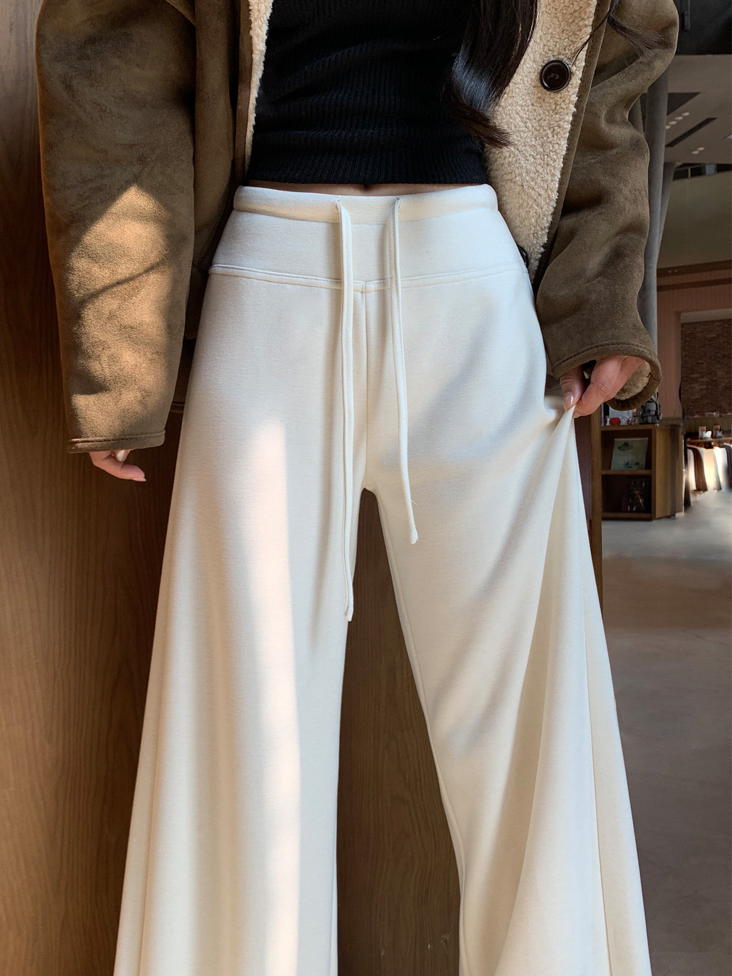 White Pants with Fleece Lining for Winter, Thickened Glutinous Rice Pants with Drape, Narrow Straight-Leg Acetate Wool Wide-Leg Pants for Women, Sports Sweatpants