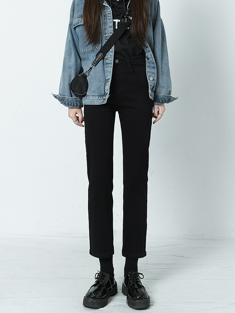 Black Cropped Straight-Leg Fleece-Lined Jeans for Women, 2025 Winter New Popular Style, Petite Slim-Fit Cigarette Pants