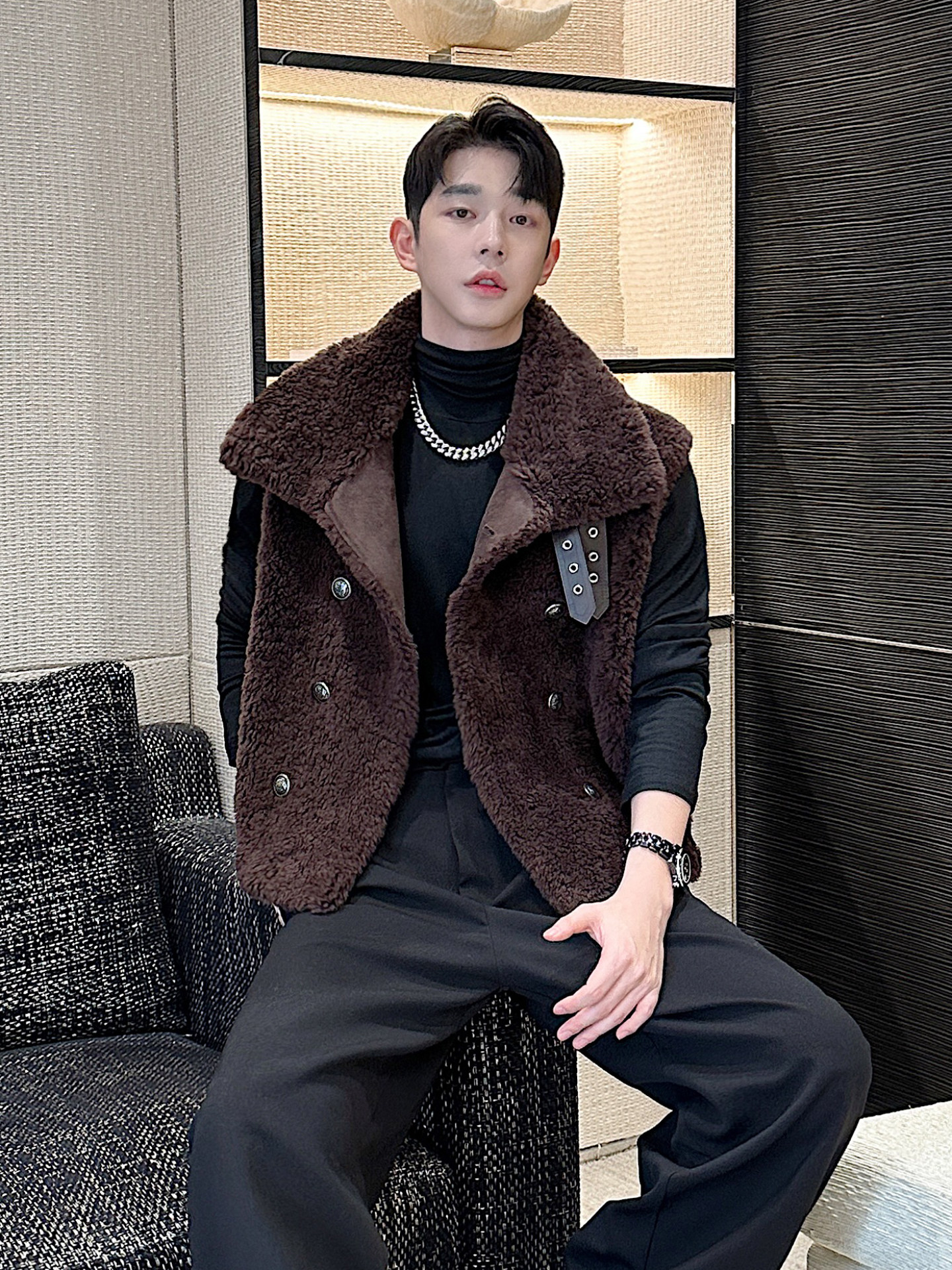Melard-Colored Lamb Wool Men's Fur Vest, Non-Leather Integrated Men's Motorcycle Short Vest for Autumn and Winter