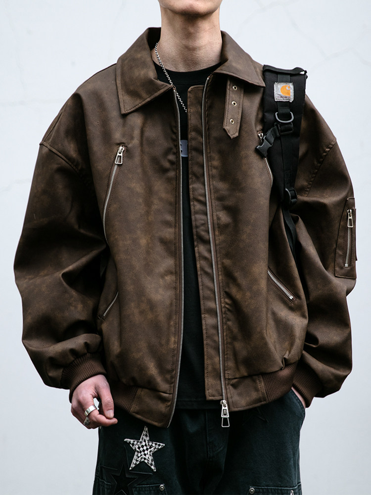 Men's Vintage Leather Jacket, Trendy Brand, Cool and Stylish, Double Zipper, Stand Collar, Loose Fit, Versatile, Windproof Biker Jacket