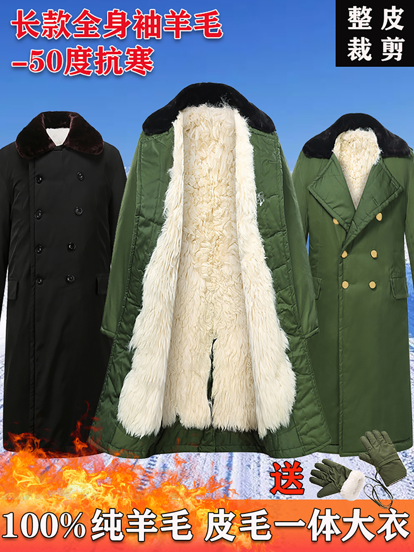 Sheepskin Military Cotton Coat for Men, Integrated Leather and Fur, Long Style, Winter Fleece-Lined, Thickened, Cold-Proof, Northeastern Traditional Wool Green Cotton Jacket