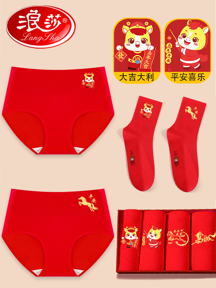 Langsha Red Underwear for Women, Zodiac Year Pure Cotton 2026 Year of the Horse, Wedding Red Socks Set, All-Cotton Bright Red Shorts