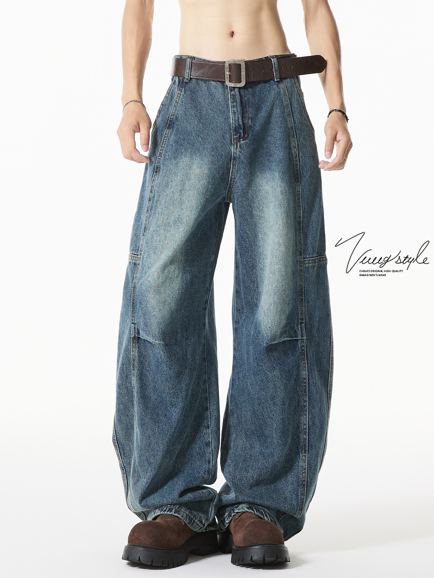 American Retro Blue Scimitar Jeans for Men, Spring, Autumn and Winter Trendy Brand Loose Straight-Leg Wide-Leg Fleece-Lined Pants for Boys