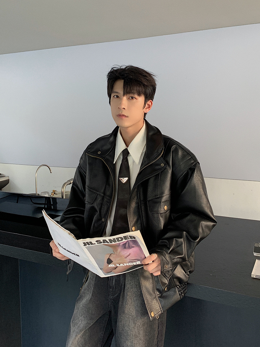 Dm Tenacious Cleanfit Loose Short Shoulder-Padded Jacket American Retro Leather Jacket Boxy Jacket for Men