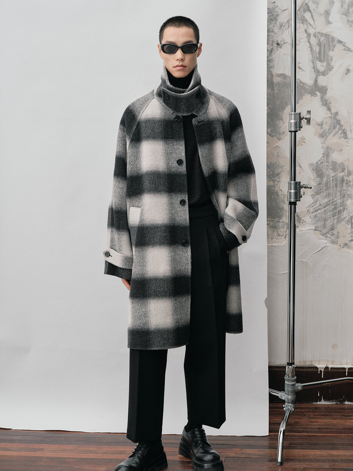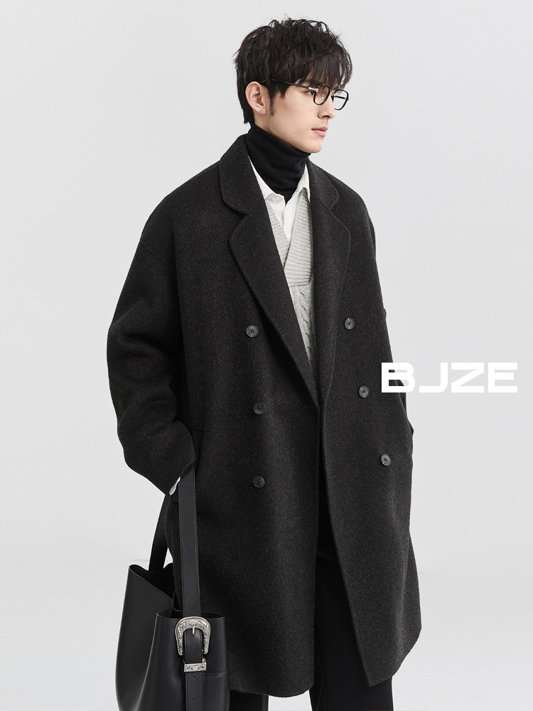 【Nans】Alpaca Wool Blend Mixed Color Plaid Texture Wide Square Collar with Tie Design Handmade Double-Sided Wool Coat