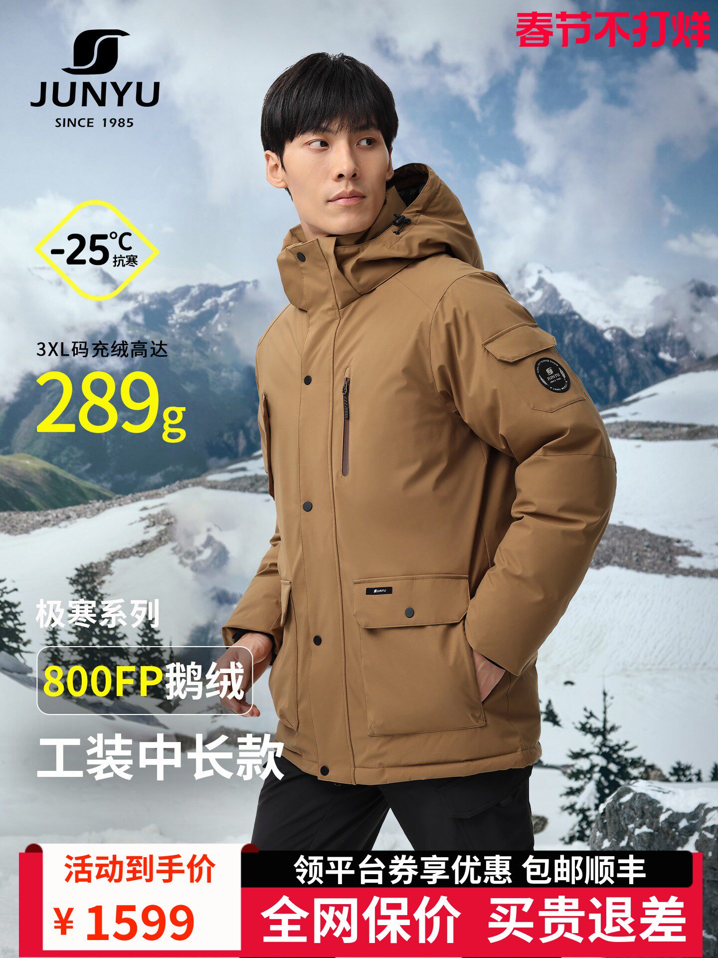 Junyu Outdoor down Jacket for Men, 800 Fill Power Goose Down, Mid-Length Winter Cold-Resistant Thickened Warm Workwear Style Coat 159
