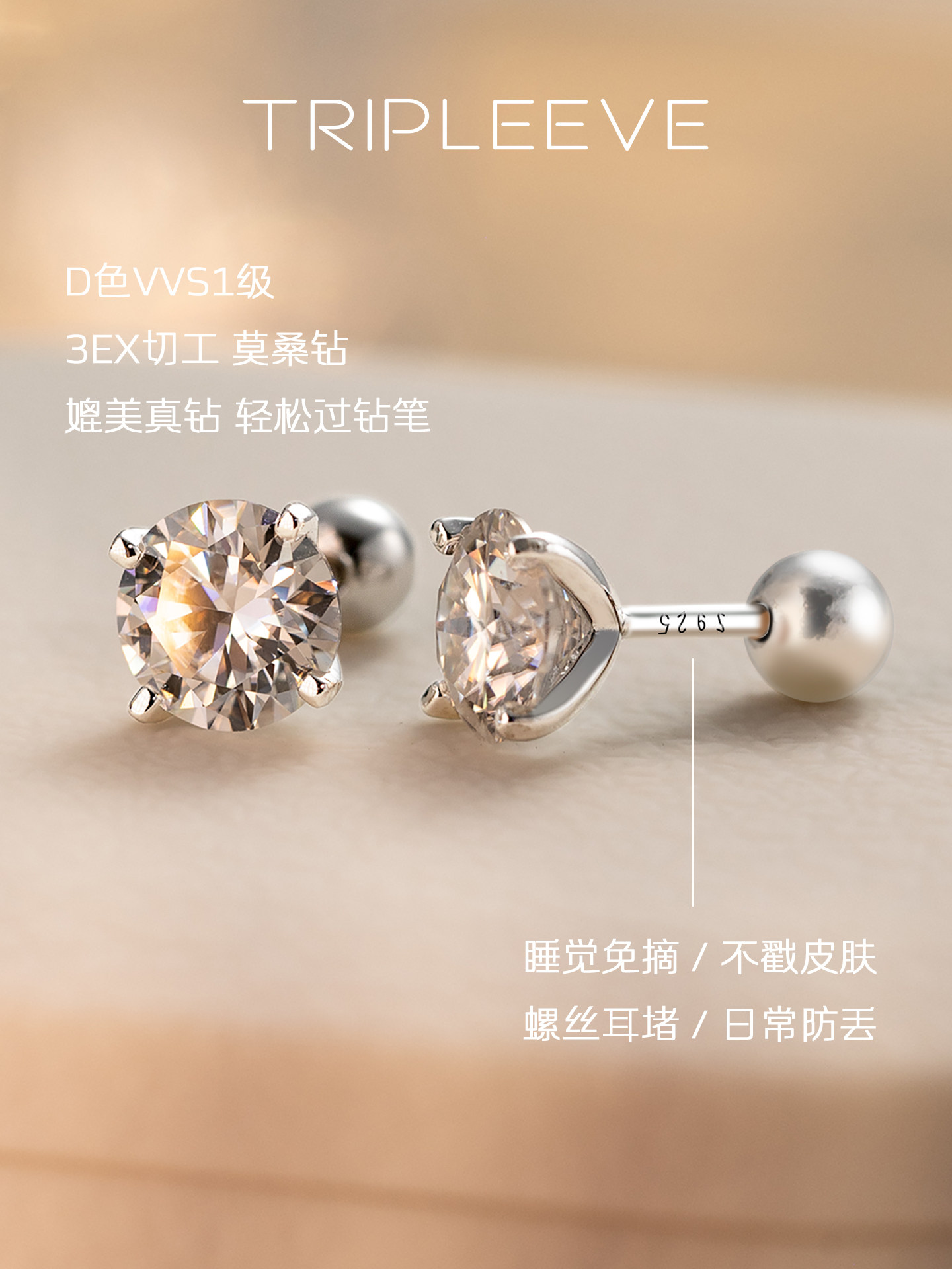 Three-Sided Eve Genuine Moissanite Diamond Earrings, Moissanite Pure Silver Short Stem Screw Ear Studs, Ear Cartilage Studs