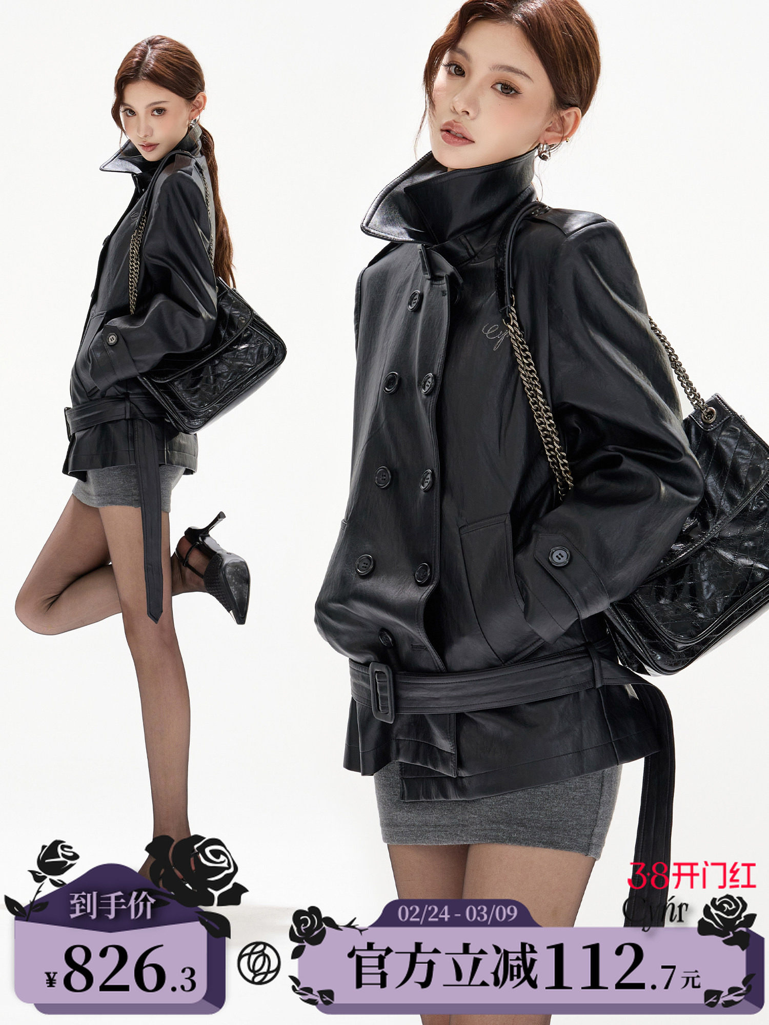 Cynr Original Design Cool and Stylish Stand-Up Collar Double-Breasted Structured Leather Jacket with Lace-Up Waist Mid-Length Jacket for Women
