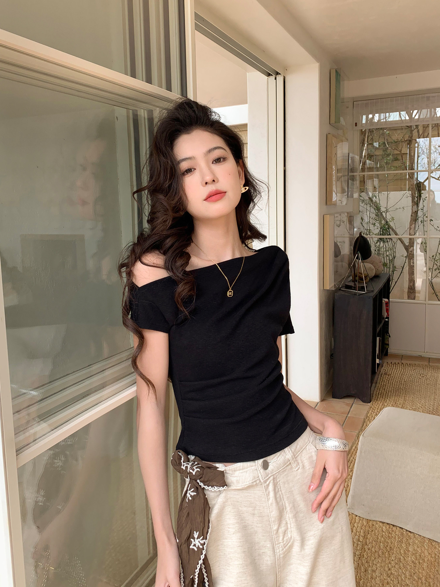 Neva Hu High-End Lightweight Off-Shoulder Short-Sleeve T-Shirt for Women, Summer Ruched Waist-Cinching Niche Design, Off-Shoulder Knitted Cropped Top