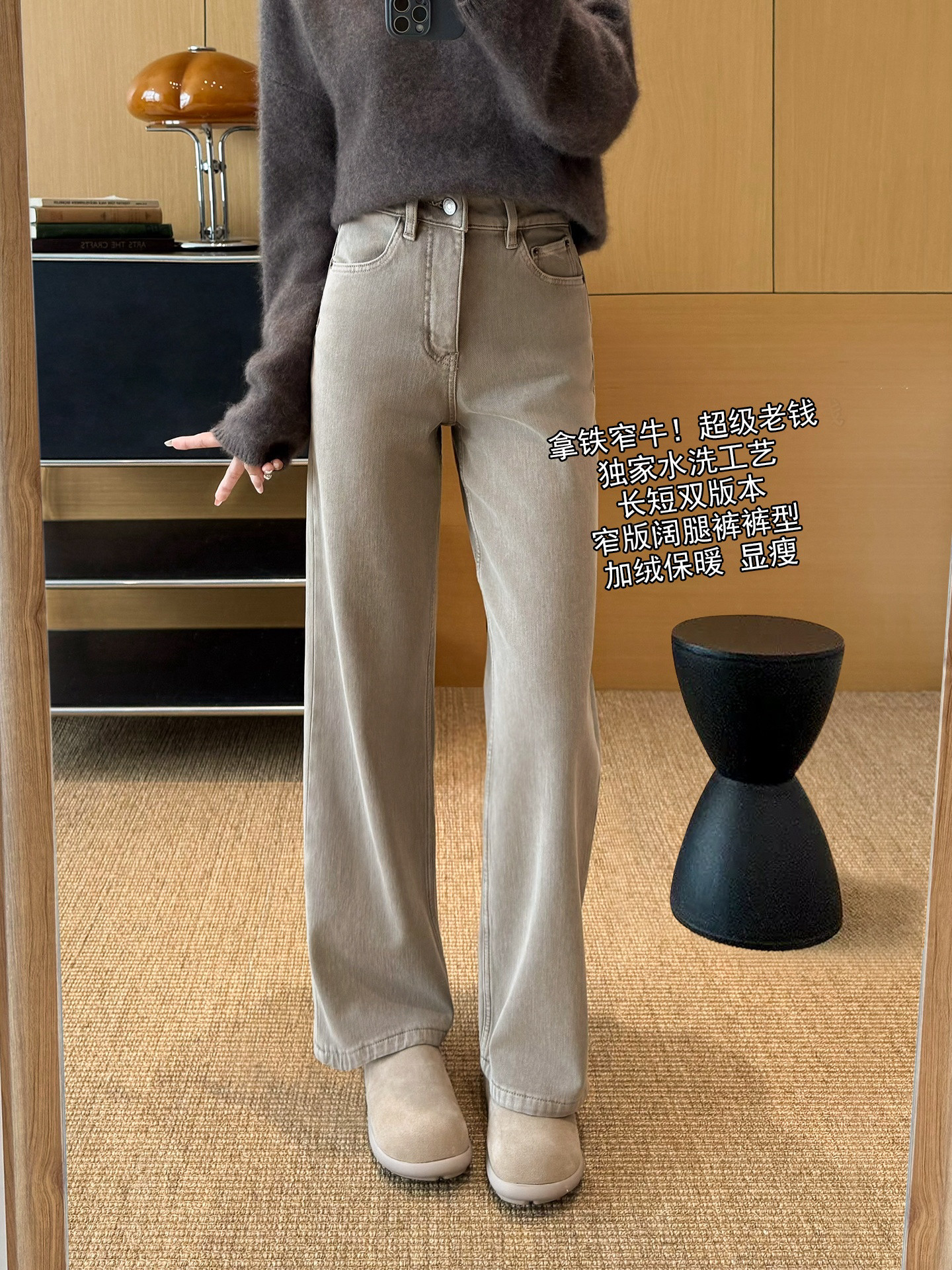 Light Mist Latte! High-End Heavy-Duty Fleece-Lined High-Waisted Casual Slim-Fit Straight-Leg Washed Jeans Denim Pants for Women in Winter