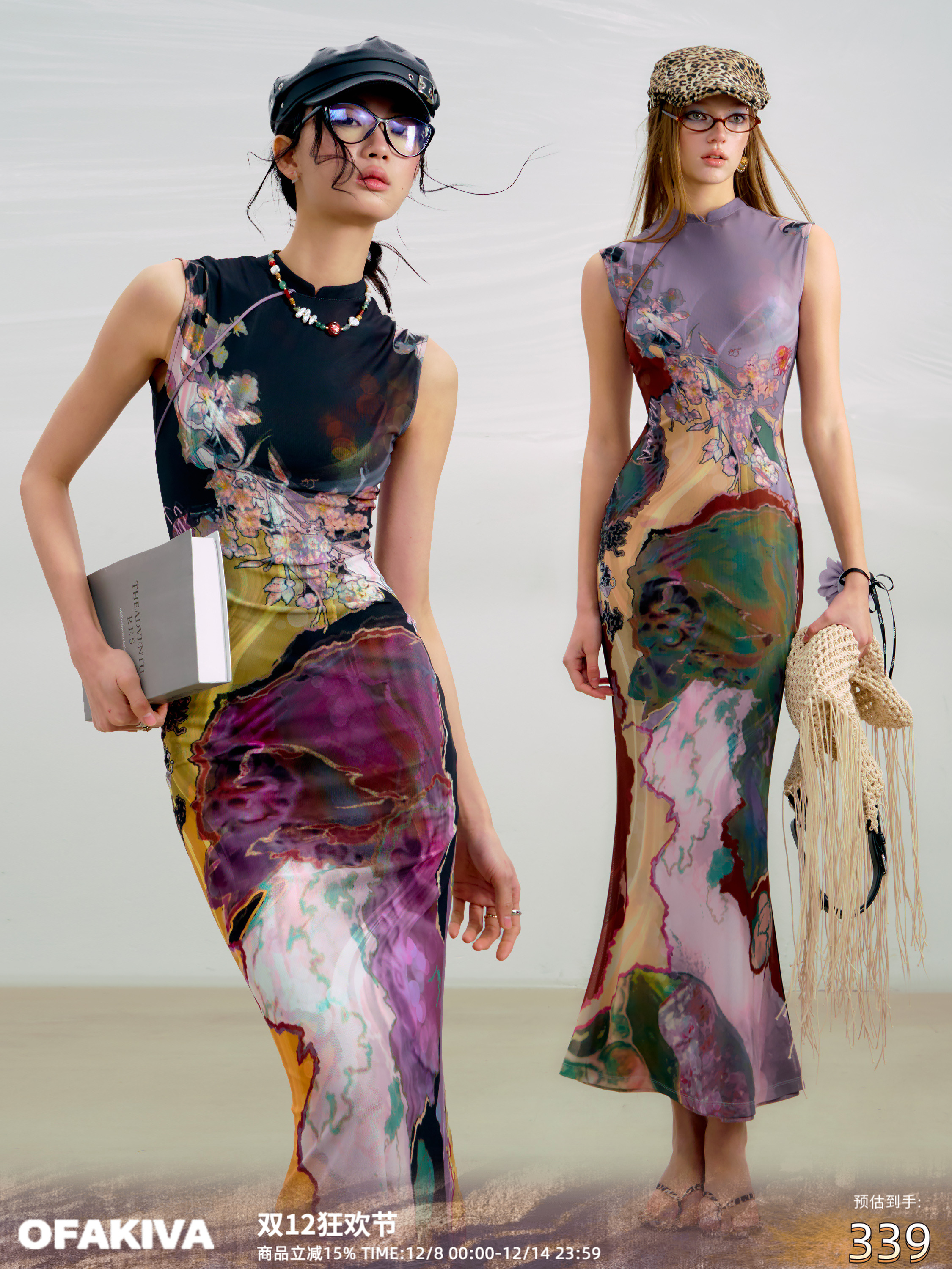[Same Style as Li Meng] Ofakiva “Three Colors” New Chinese-Style Reversible Color-Blocked Printed Cheongsam Dress