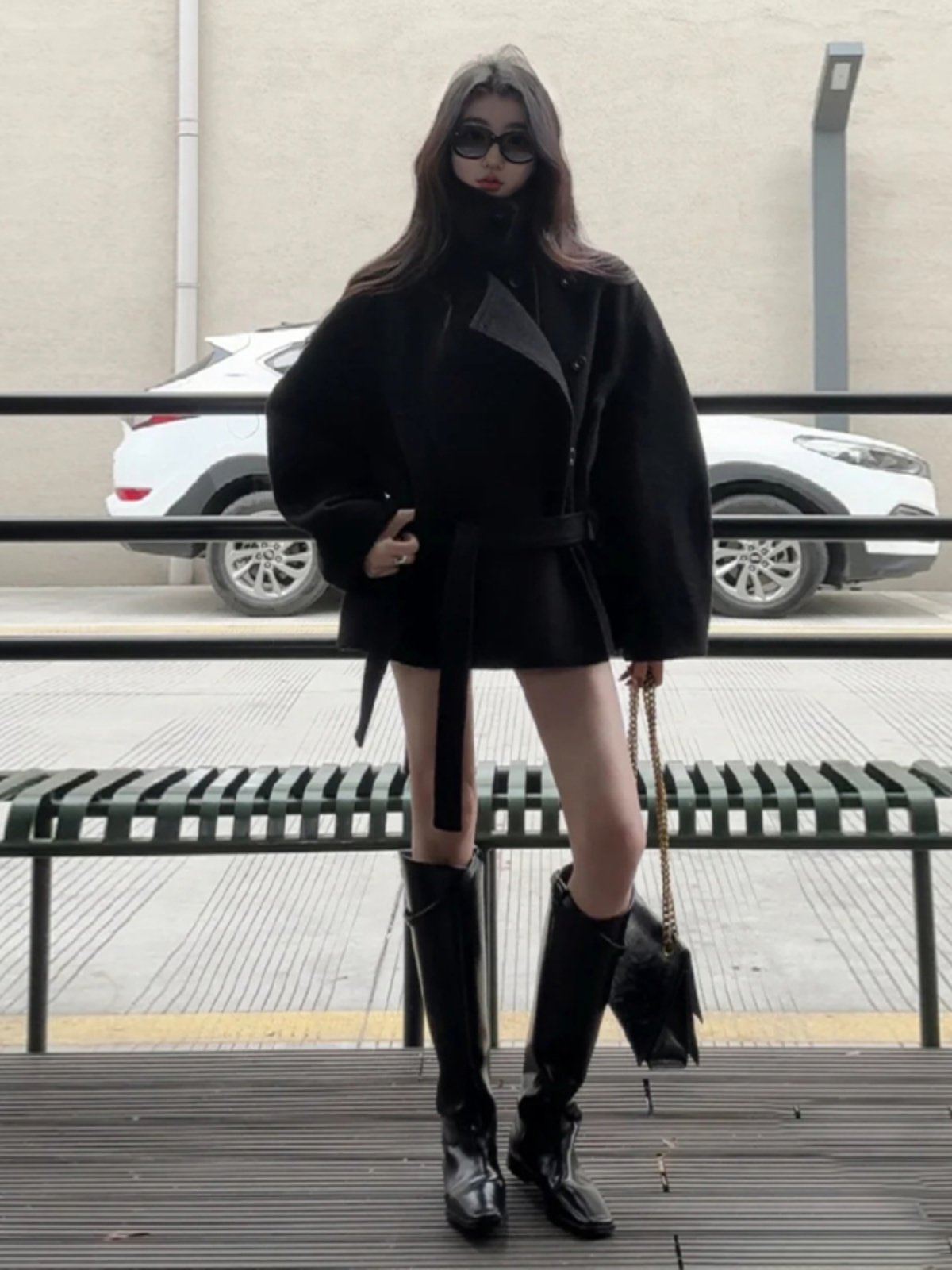 Short Stand-Collar Black Woolen Coat for Women, 26 Spring, American Retro Style, High-End Feel, Petite Woolen Coat, Short Coat