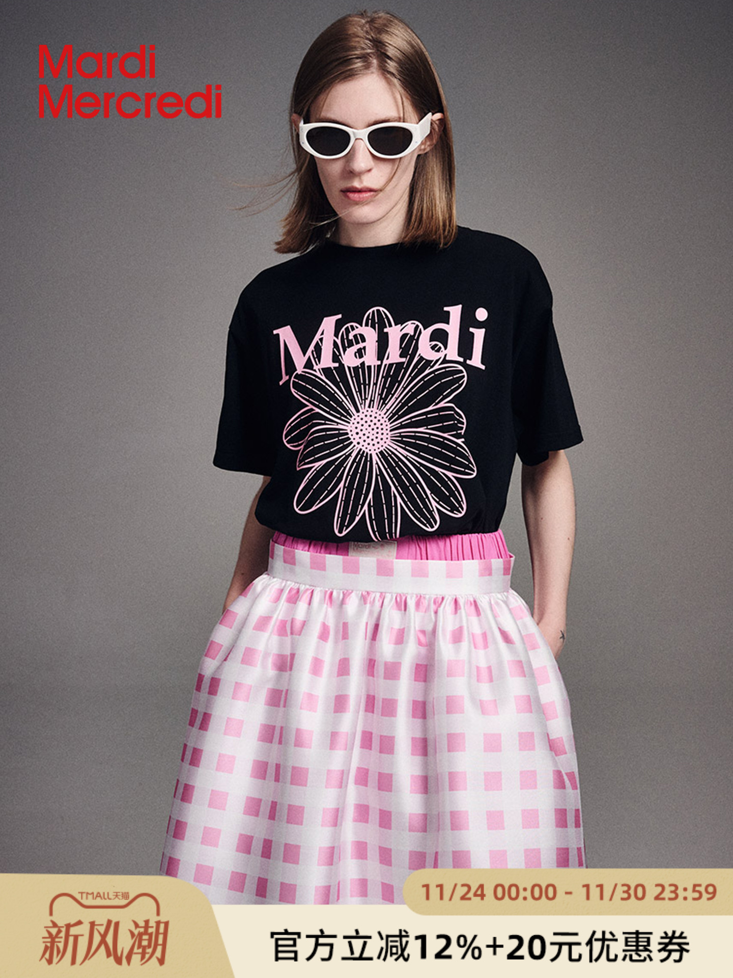Mardimercredi Little Daisy Black Pink Short Sleeve T-Shirt Women's Round Neck Loose Half Sleeve Top Korean Style Summer New Arrival