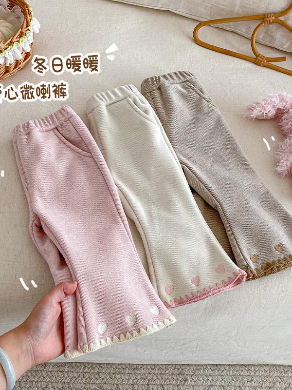 Girls' Fleece-Lined Bell-Bottom Pants 2025 New Winter Style for Baby Girls, Stylish Heart-Shaped Thickened Casual Pants, Korean Style Trendy Pants