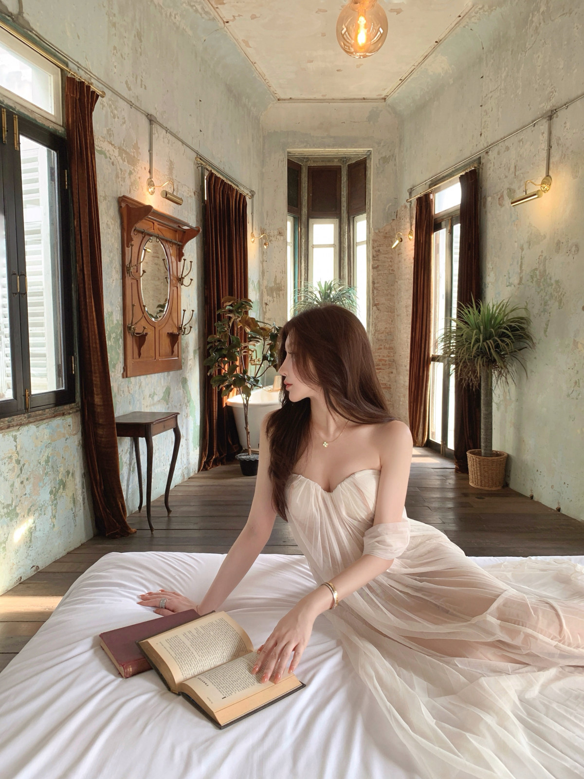 Junstudio【The Arrival of the Beauty Goddess】Ribbon Slim Fit Tube Top Dress Lace Mesh Dress White Fairy Dress