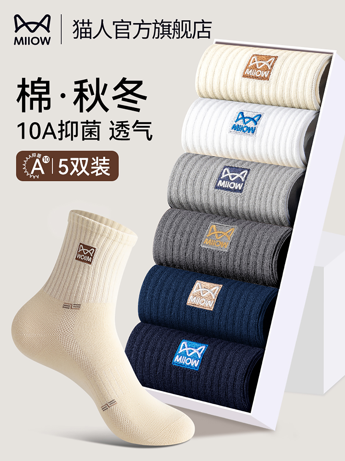 【10A Antibacterial】Catman Men's Socks Autumn and Winter 100% Genuine Pure Cotton Mid-Calf Deodorant Sweat-Absorbing Sports Long Socks