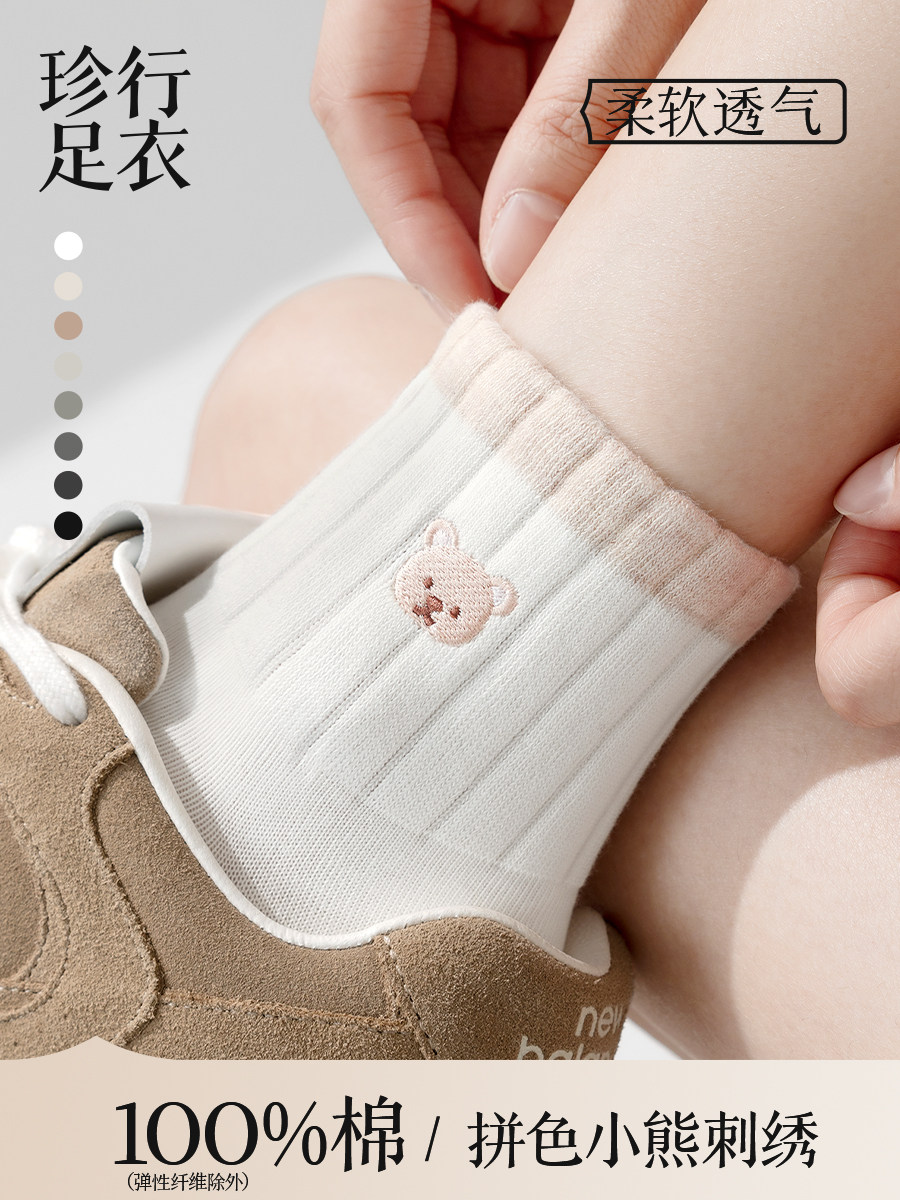 Socks for Women, Autumn and Winter Style, Bear Embroidery, White Student Socks, Cute, Moisture-Wicking, Breathable, Pure Cotton, Mid-Short Tube Socks