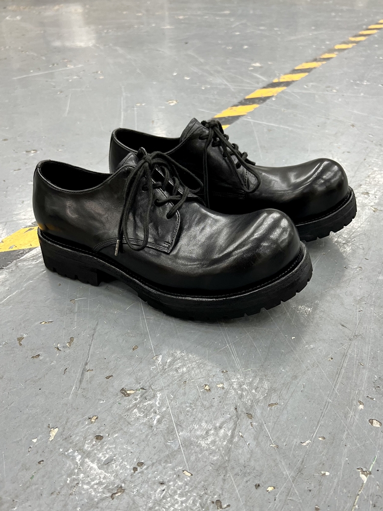 Black Top-Layer Horsehide Hand-Stitched Goodyear Welted Washed Dog-Tooth Sole Mickey Derby 002 Leather Shoes