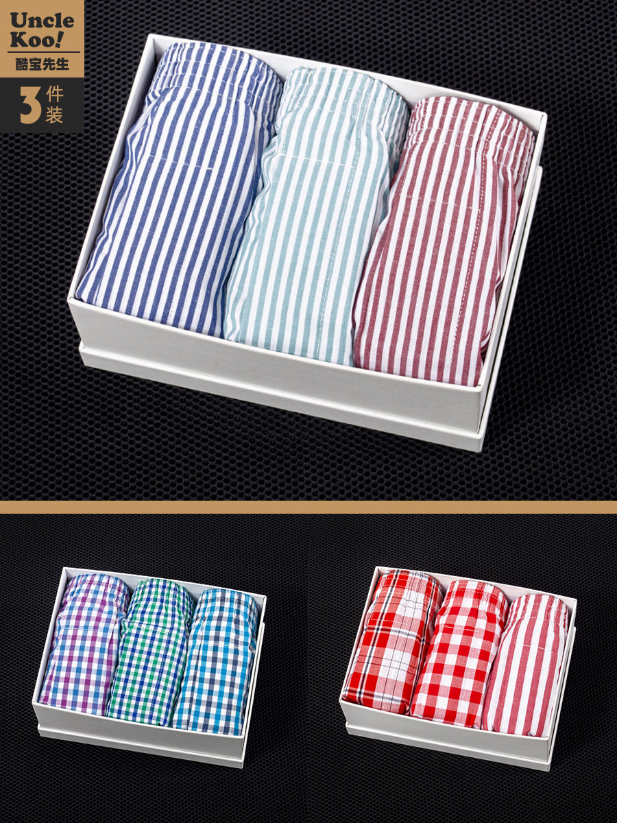 Mr. Coolbao Three-Pack Striped Boxer Shorts Plaid Loose One-Piece Split Cotton Home Shorts Underwear for Men